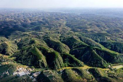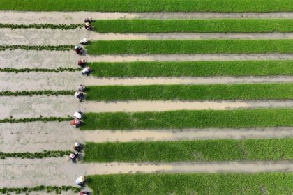 This aerial photo taken on April 17, 2023 shows a villager working…