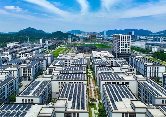 Photovoltaic panels are seen on roofs of buildings in an industrial park in Ningbo, east China's Zhejiang province. (Photo by Hu Xuejun/People's Daily Online)
