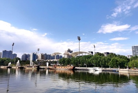 Under the blue sky in Linfen, north China’s Shanxi province, people are working out in the fresh air along the ancient city walls and Fenhe River.