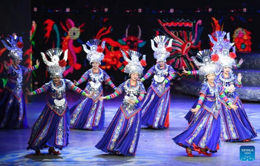 Actors perform in the show “Colorful Guizhou Style” at Guiyang Grand Theatre in Guiyang, southwest China’s Guizhou Province, June 5, 2023. The “Colorful Guizhou Style” show, which debuted in 2006, has been performed in over 40 countries or regions worldwide and seen by over 10 million people. The show illustrates the vibrant ethnic culture of Guizhou and the hospitable people living there. (Xinhua/Yang Wenbin)