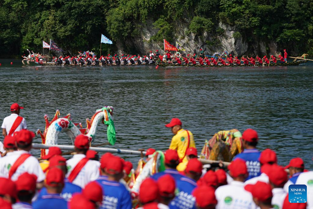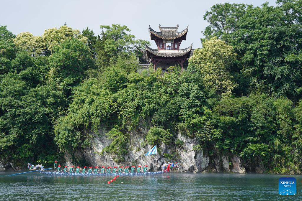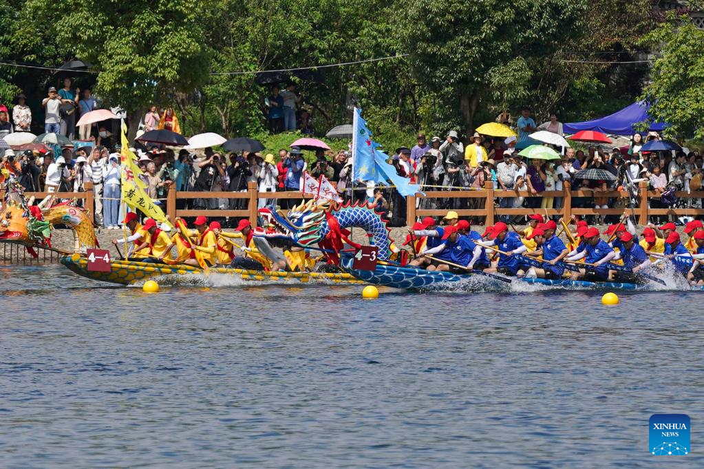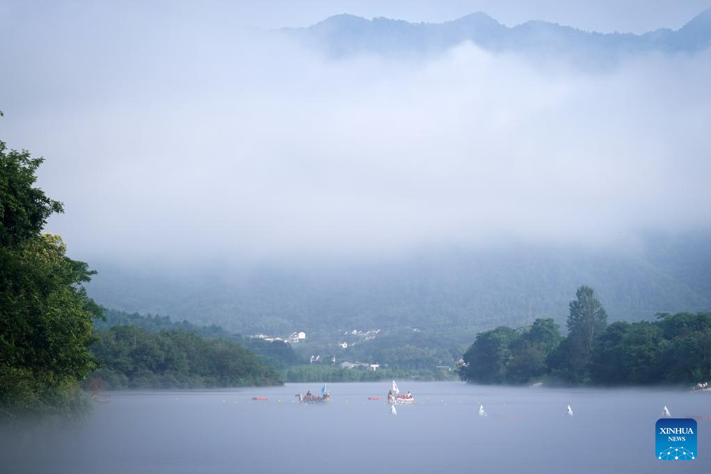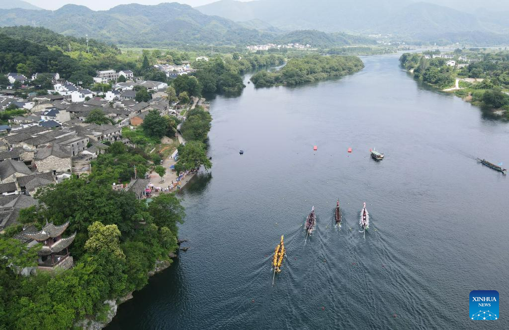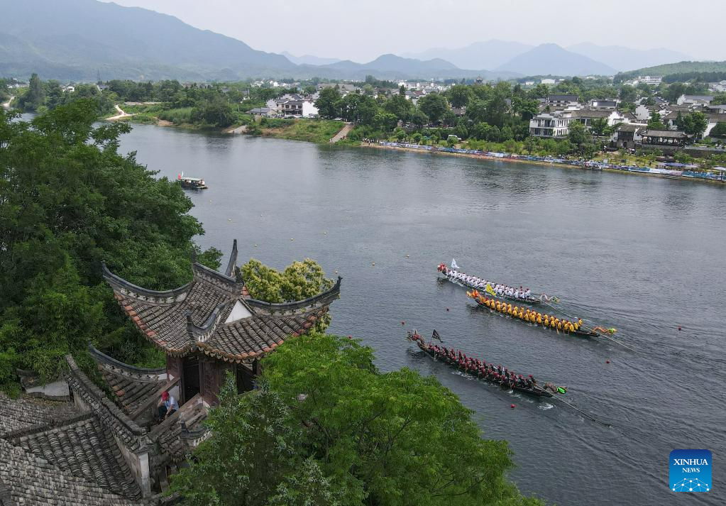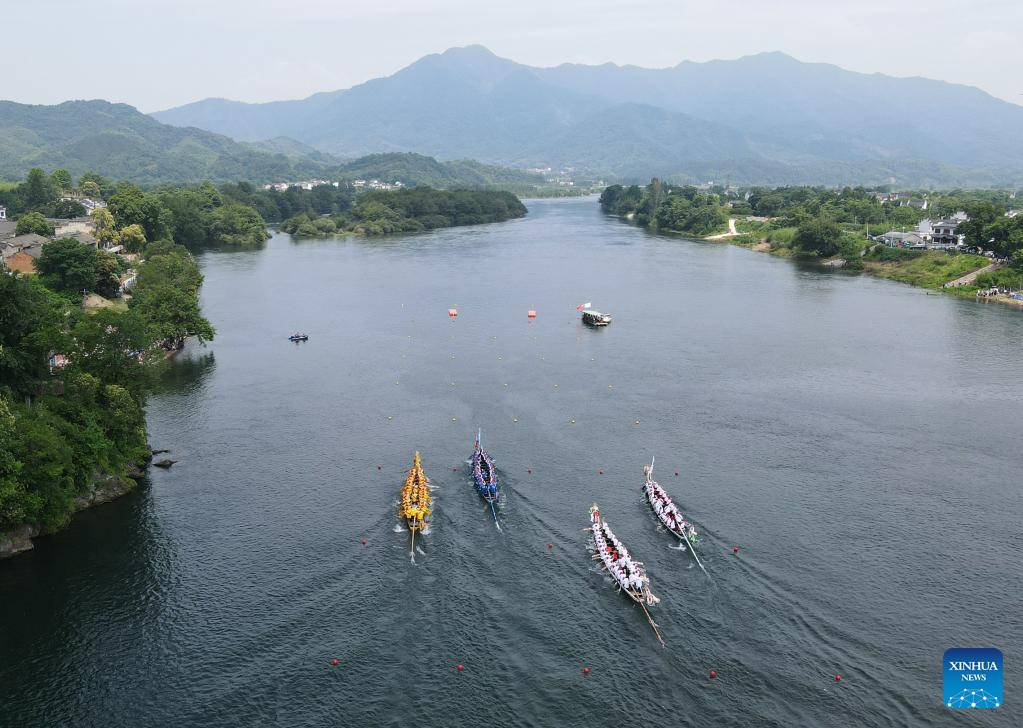 A dragon boat race is held in Taohuatan Township, Jingxian County, east China’s Anhui Province, June 21, 2023. A total of 25 teams participated in a dragon boat race, which opened here Wednesday, to celebrate the upcoming Dragon Boat Festival. This year’s festival falls on June 22. (Xinhua/Du Yu)