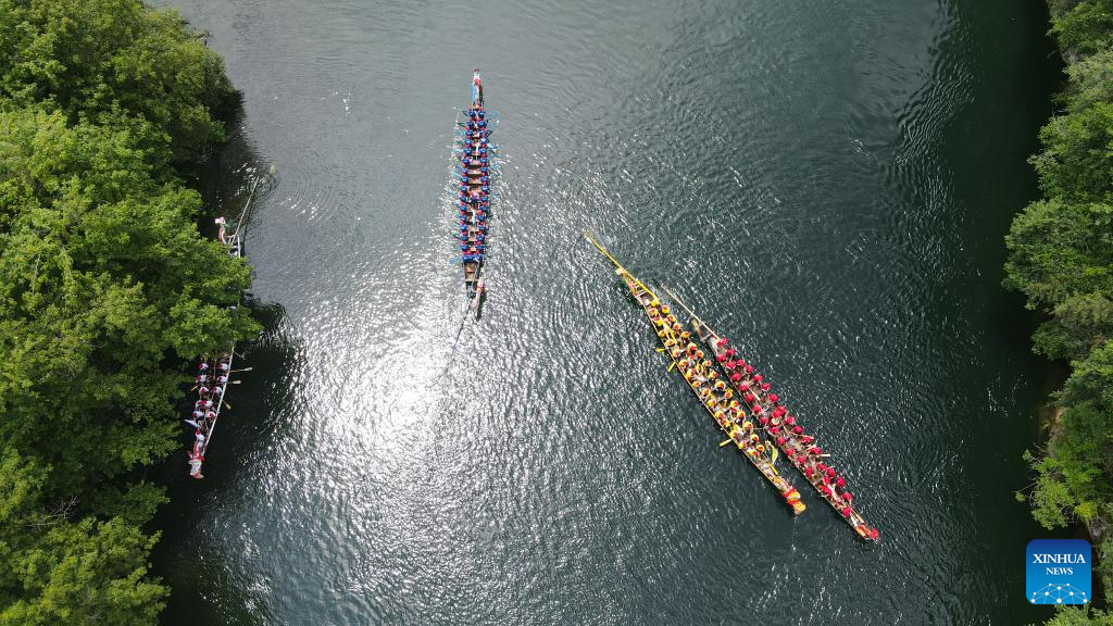 This aerial photo taken on June 21, 2023 shows dragon boats taking part in a race in Taohuatan Township, Jingxian County, east China’s Anhui Province. A total of 25 teams participated in a dragon boat race, which opened here Wednesday, to celebrate the upcoming Dragon Boat Festival. This year’s festival falls on June 22. (Xinhua/Du Yu)