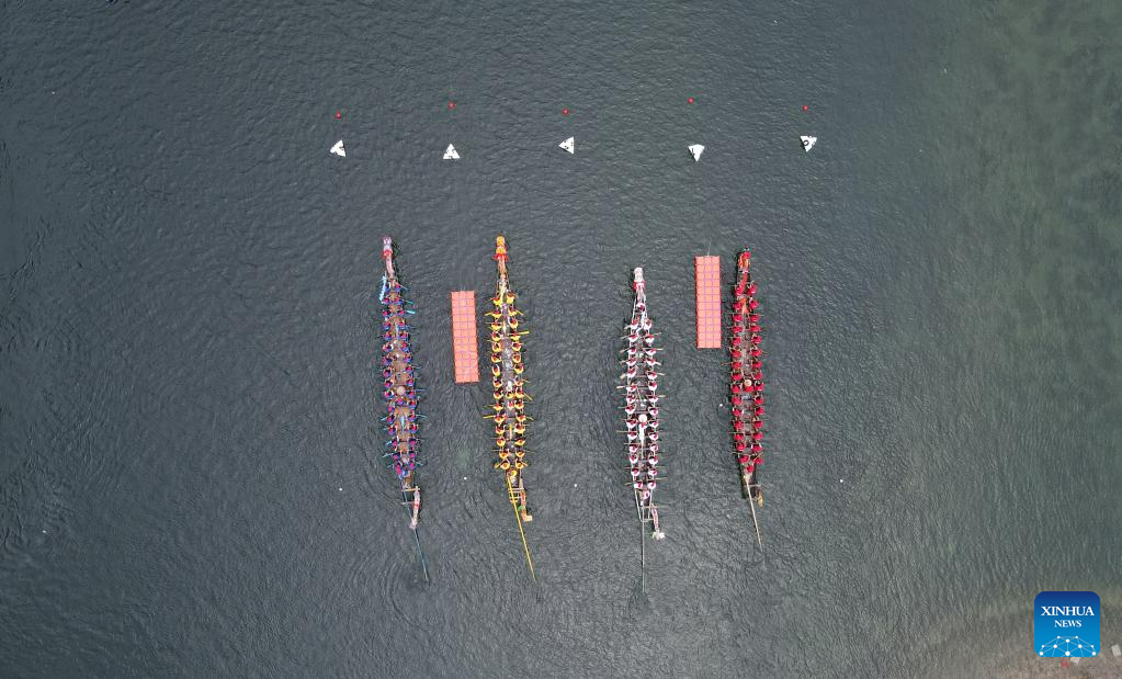 This aerial photo taken on June 21, 2023 shows some dragon boats getting prepared for a race in Taohuatan Township, Jingxian County, east China’s Anhui Province. A total of 25 teams participated in a dragon boat race, which opened here Wednesday, to celebrate the upcoming Dragon Boat Festival. This year’s festival falls on June 22. (Xinhua/Du Yu)