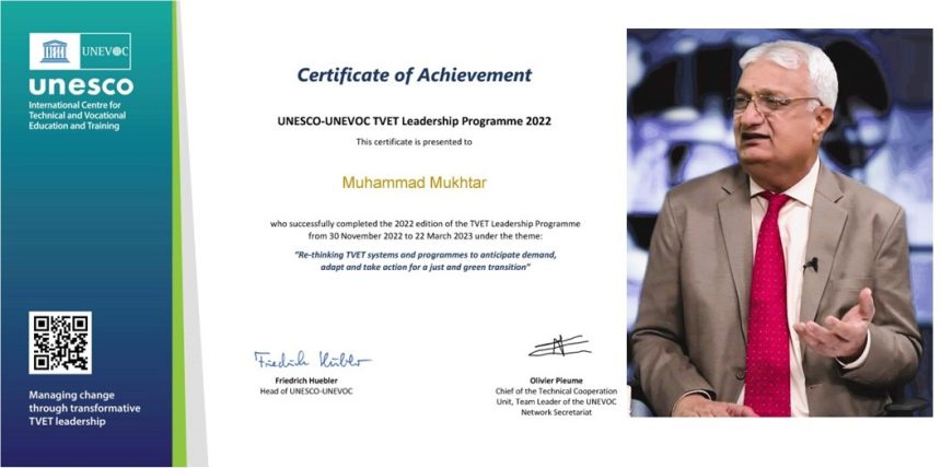 Academic institutions across the globe can play a significant role in saving environments and controlling impending harmful climatic changes. This was stated by Professor Dr. Muhammad Mukhtar, Vice Chancellor of National Skills University Islamabad, who is the recipient of the certificate of achievementfrom the UNESCO/UNEVOCon “Re-thinking TVET system and Programmes to anticipate demand, adapt and take action for a just and green transition.” The said academic leaders’ training was designed after UNESCO/UNEVOC concerns stated as “Catastrophic trends caused by climate change are harming people and ecosystems around the world. Shifts in temperatures and weather patterns have impacted people’s lives, jobs, and long-term access to finite resources. The degree of planetary heating is causing more damage as sea levels rise, biodiversity loss worsens, and ecosystem ceases functioning.”
