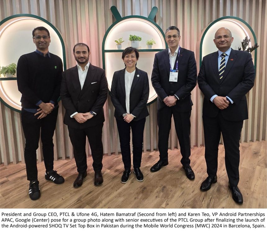 Islamabad/Barcelona – Feb 28, 2024: Pakistan’s largest telecommunications and integrated ICT services provider, PTCL Group, is set to launch in Pakistan a cutting-edge Shoq TV Set-top Box powered by Android TV, to transform the TV viewing experience for its customers. It was announced by the President and Group CEO, PTCL & Ufone 4G, Hatem Bamatraf, and Karen Teo, VP Android Partnerships APAC, Google during Mobile World Congress (MWC) 2024 in Barcelona, Spain. The Android TV Set-top Box will feature multiple Google apps, including the Play Store, in addition to a sleek User Interface (UI) and captivating graphics to provide a transformative user experience.