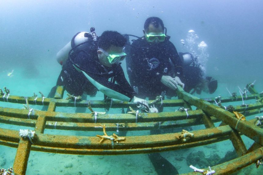 Corals are being transplanted in the waters of Fenjiezhou Island of Hainan Province, south China, June 8, 2023. (Xinhua/Zhang Liyun)