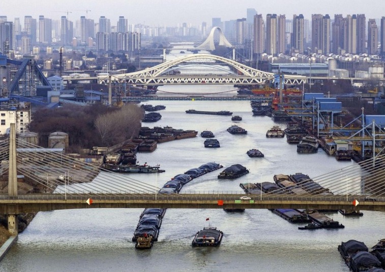 Vessels carrying production and living supplies shuttle back and forth on the Huai'an section of the Beijing-Hangzhou Grand Canal in east China's Jiangsu province, Feb. 13, 2024. (Photo by He Jinghua/People's Daily Online)