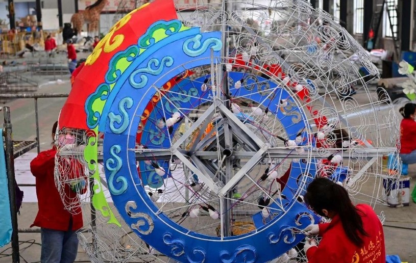 In a workshop of Zigong Longteng Culture and Art Co., Ltd. based in Zigong, southwest China’s Sichuan province, the skeleton of a loong-shaped lantern was completed amid flying sparks from welding.